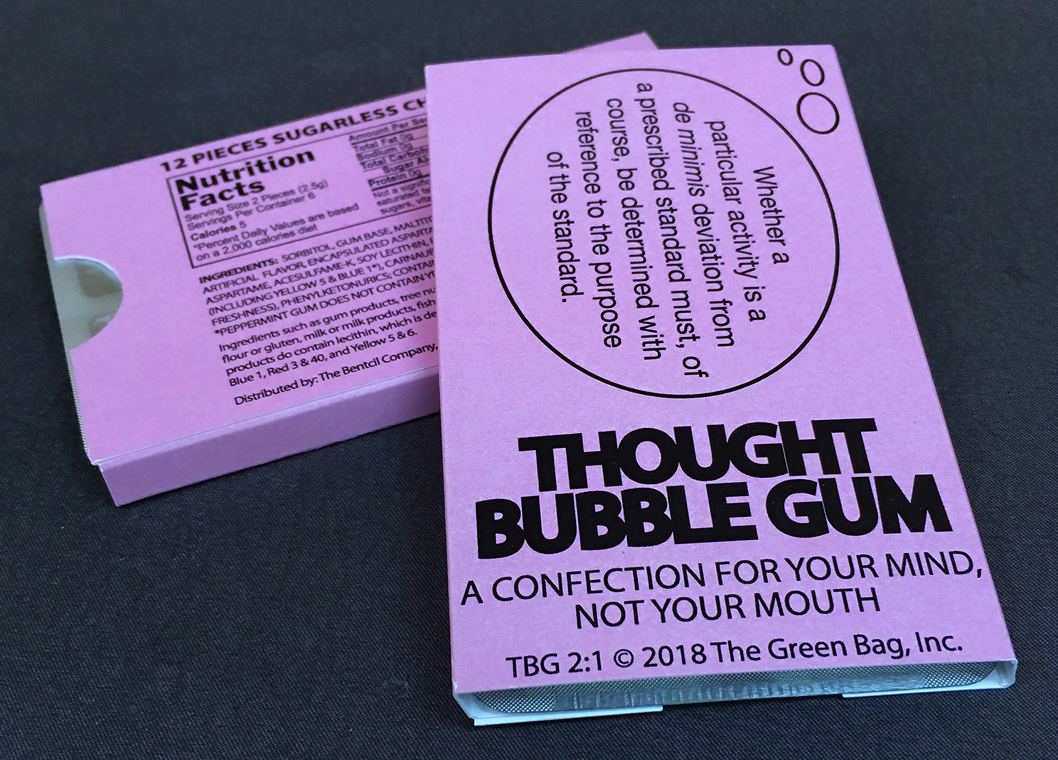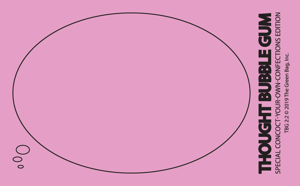 "Thought Bubble Gum" began as the Green Bag's solution to the problem of appropriate gum to accompany our Supreme Court Sluggers trading cards. We wanted to include gum in our old-fashioned, baseball-style trading card packets, but we lacked the resources (and probably the courage) to deal with regulators and consumers of food. And so we settled on confections for the mind, not the mouth. Look for them inside some packages of Supreme Court Sluggers cards, and perhaps in the company of other products as well.